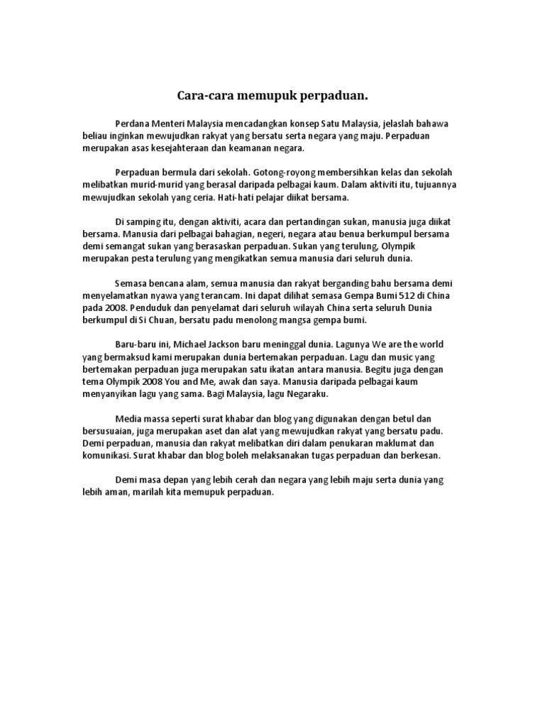 CONTOH KARANGAN PT3. Sebenarnya kita bolehlah mengadakan aktiviti gotong-royong di taman-taman perumahan untuk memupuk perpaduan kaum rakyat di Malaysia. Penutup Karangan Langkah untuk Memupuk Perpaduan.